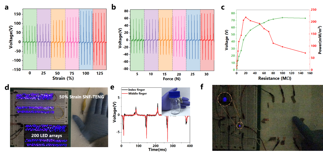 同时,研发团队以PHS纤维为摩擦起电层,液态金属-银片-SEBS印刷可拉伸导体为电极,SEBS/织物为基底,开发出了高性能可拉伸摩擦纳米发电机,实现了机械能、水能收集及自供电压力和触碰传感。该摩擦纳米发电机(面积:2cm2*2cm2)的输出电压达到了85-160V(0%-125%拉伸),短路电流达到了4-7μA,峰值功率219.66 mW m-2,能够为200个LED、电子手表等器件供电。同时,利用该摩擦纳米发电机能够无需外部电源实现对手指运动行为的实时检测,同时可作为无源触碰传感器阵列实现对触碰行为的实时定位与显示。