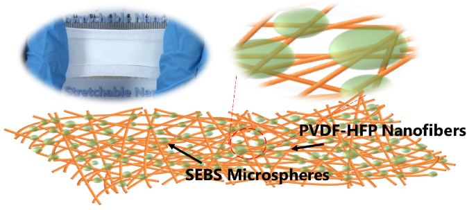长期以来,基于高压静电纺丝方法加工得到的纳米纤维网络存在拉伸性能差、结构稳定性低、易脱层等缺点。为解决这一问题,该研究团队首次提出了同步静电纺丝聚偏氟乙烯-六氟丙烯共聚物(PVDF-HFP)和静电喷雾氢化苯乙烯-丁二烯嵌段共聚物(SEBS)的加工方法,开发出了具有高拉伸率(断裂伸长率490%)、高疏水(静态接触角140°)且透气的PHS纳米纤维材料。