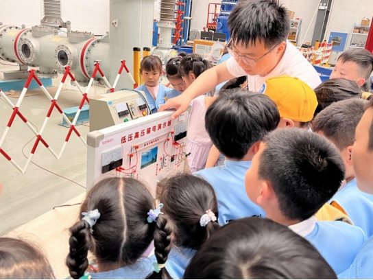 参与者首先参观了湖北工业大学北区高压试验大厅。试验大厅是华中地区高校中电压等级最高的室内高压装置,直流±800kV,交流1200kV,展示了湖北工业大学在高压技术领域的领先地位。2名专业教师深入浅出地介绍了高压技术的原理和应用,使参与者对高压技术有了初步的了解。互动环节设计巧妙,通过问答和模拟操作,增强了参与者的参与感和体验感。