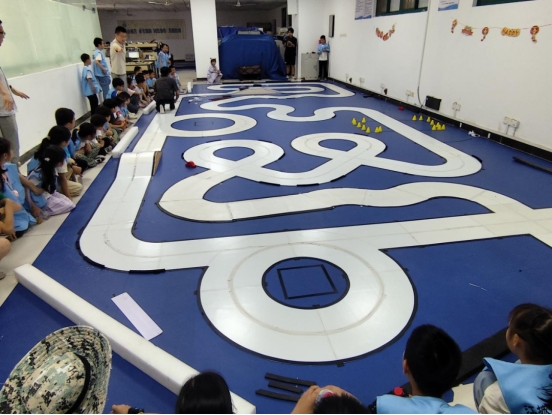 然后参观了实训楼六楼“蓝电”科技中心,通过展示智能小车的物理原理与机械结构,向参与者展示了智能电网领域的创新成果。现场智能小车演示与互动环节,由2名教师和4名志愿者共同负责,通过实际操作演示和互动问答,使参与者对智能小车有了更深入的认识。讲解和互动相结合,既传达了科学知识,又激发了参与者的探索兴趣。