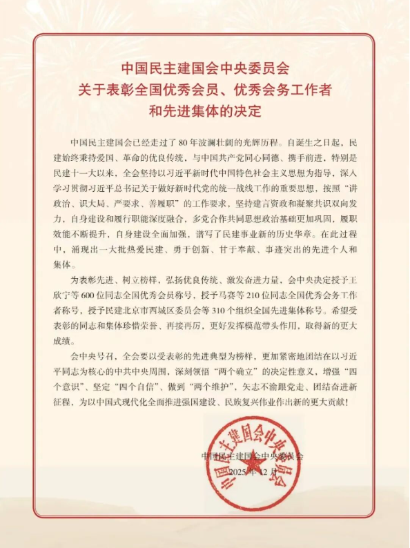 2025年,适逢中国民主建国会创建八十周年。为表彰先进典型,激励广大会员和各级组织传承民建优良传统、砥砺前行,共同为中国特色社会主义建设事业作出新的更大贡献,近日,民建中央召开了庆祝中国民主建国会成立80周年大会,印发了《关于表彰全国优秀会员、优秀会务工作者、先进集体的决定》《关于表彰2025年参政议政工作的决定》,民建湖工大支部张晓星、袁颂东等会员获得民建全国表彰。