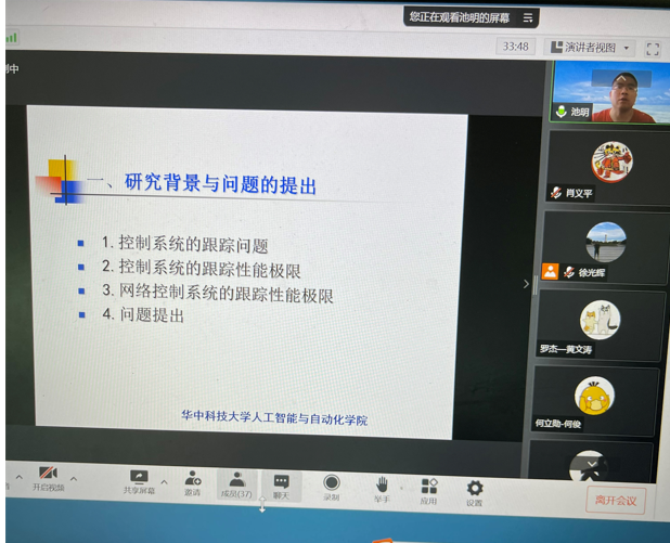 2022年6月12日,华中科技大学池明副教授在腾讯会议为学校师生作了题为“网络控制系统性能极限分析”的学术报告。电气学院部分教师及2019级、2020级、2021级研究生参加了报告会,报告会由电气与电子工程学院徐光辉副教授主持。此次报告为“学术校庆·百场学术论坛”系列讲座活动之一。